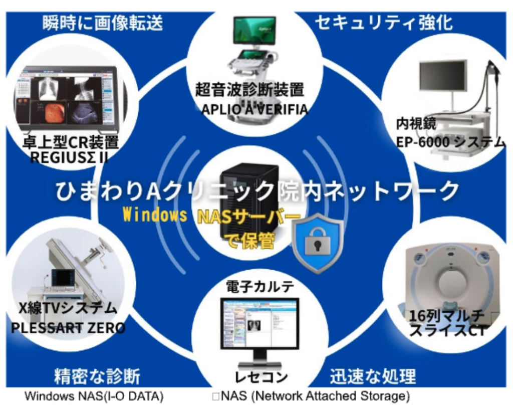 当院では、レセコン一体型電子カルテ(MedicoM-HRV)と検査機器をLANケーブルでネットワークを構築し、BUFFALOのNAS(LS510D)に、医療画像やデータファイル及び患者ID等を保管しています。